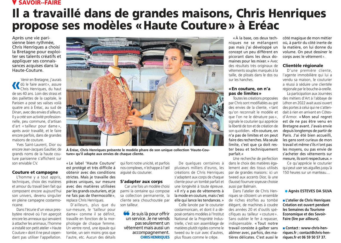 Les créations de Chris Henriques attirent l’attention des médias, tant au niveau régional que national. Son parcours, marqué par l’excellence artisanale et la passion de la couture sur mesure, a été mis en lumière par de nombreux articles qui soulignent son talent et son engagement dans les métiers d’art.